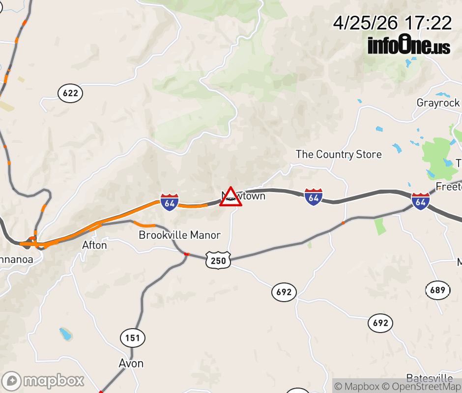 On I-64 East at mile marker 103.8 in the County of Albemarle, motorists can expect delays due to a vehicle crash. Updated: Sat 4/25/26 5:22 PM EDT ![]() Updated: Sat 4/25/26 5:22 PM EDT |