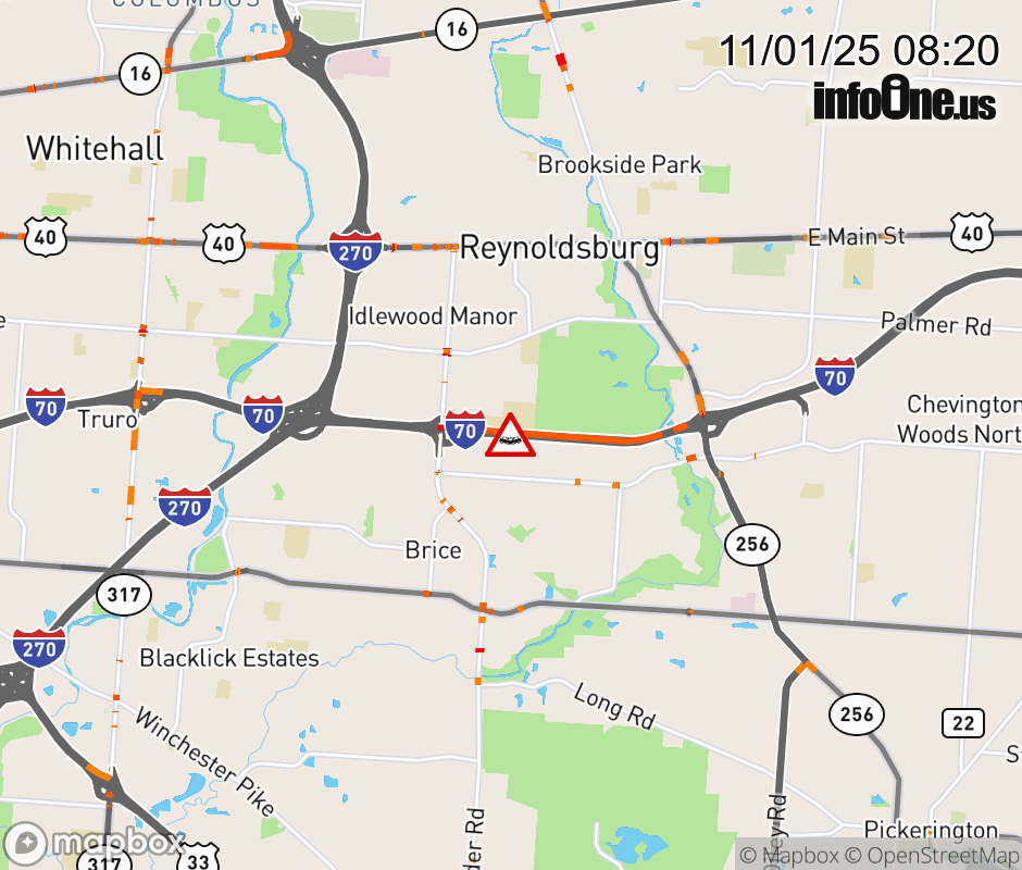 The 2 left lanes are blocked on I-70 West beyond SR-256 the left lane is blocked on I-70 East beyond Brice Rd North, due to a crash. Updated: Sat 11/1/25 8:20 AM EDT ![]() Updated: Sat 11/1/25 8:20 AM EDT  |