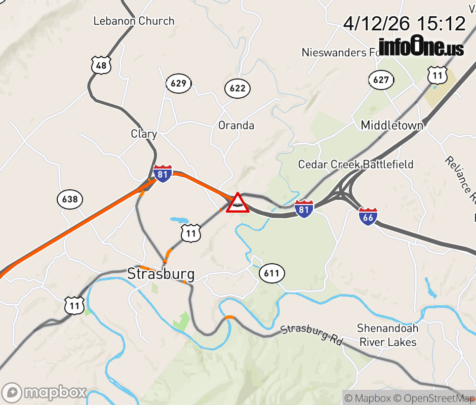 On I-81 North at mile marker 298.4 in the County of Shenandoah, motorists can expect delays due to a vehicle crash. Traffic backups are approximately 3.0 miles. Updated: Sun 4/12/26 3:12 PM EDT ![]() Updated: Sun 4/12/26 3:12 PM EDT |