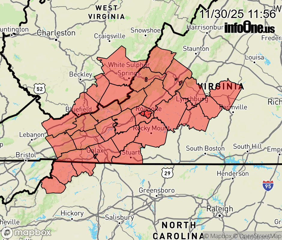 Canceled 11/30/25 12:00 PM Winter Weather Advisory issued November 30 at 11:55AM EST until November 30 at 12:00PM EST by NWS Blacksburg VA Any precipitation this afternoon will be spotty and mainly rain. Temperatures will rise above freezing as well. Still, those traveling should continue to exercise caution, especially along higher ridges along the Blue Ridge and Alleghanys. ![]() |