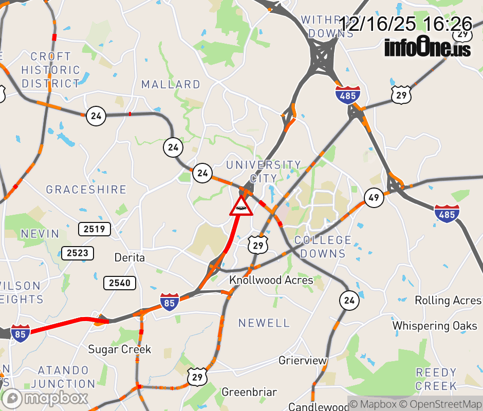 The right shoulder is closed at Exit 45A (W W.T.Harris Blvd). Updated: Tue 12/16/25 4:26 PM EST ![]() Updated: Tue 12/16/25 4:26 PM EST |