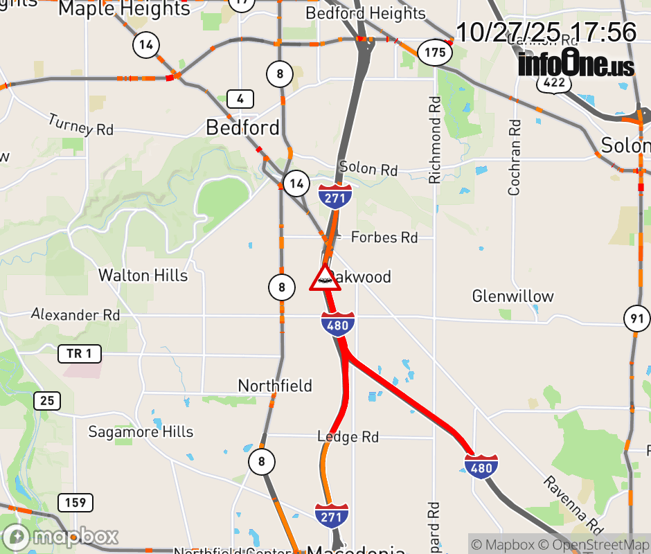 The left lane is blocked on I-271/I-480 North at I-271/I-480/SR-14 North, due to a crash. Updated: Mon 10/27/25 5:56 PM EDT ![]() Updated: Mon 10/27/25 5:56 PM EDT |