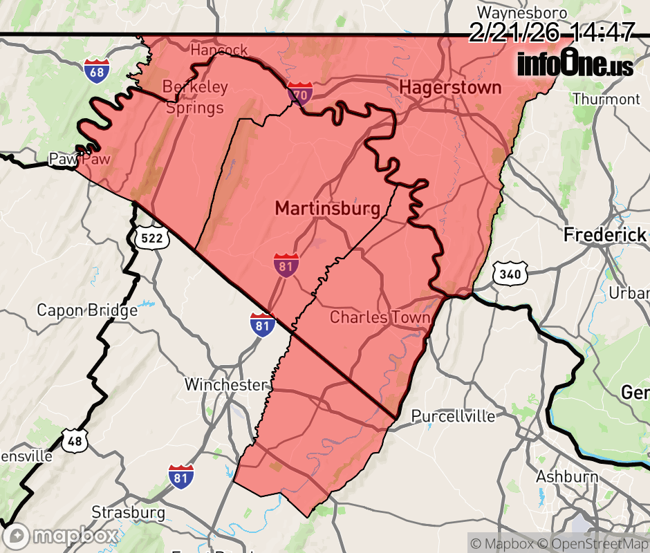 Canceled 2/21/26 10:04 PM Winter Storm Warning issued February 21 at 2:46PM EST until February 23 at 10:00AM EST by NWS Baltimore MD/Washington DC * WHAT... Heavy snow expected. Total snow accumulations between 3 and 6 inches with locally 8 inches on the higher hills. Winds gusting as high as 35 mph. * WHERE... In Maryland, Washington County. In Virginia, Clarke County. In West Virginia, Berkeley, Jefferson, and Morgan Counties. * WHEN... From 3 PM Sunday to 10 AM EST Monday. * IMPACTS... Roads, and especially bridges and overpasses, will likely become slick and hazardous. Plan on slippery road conditions. The hazardous conditions could impact the Monday morning commute. ![]() |