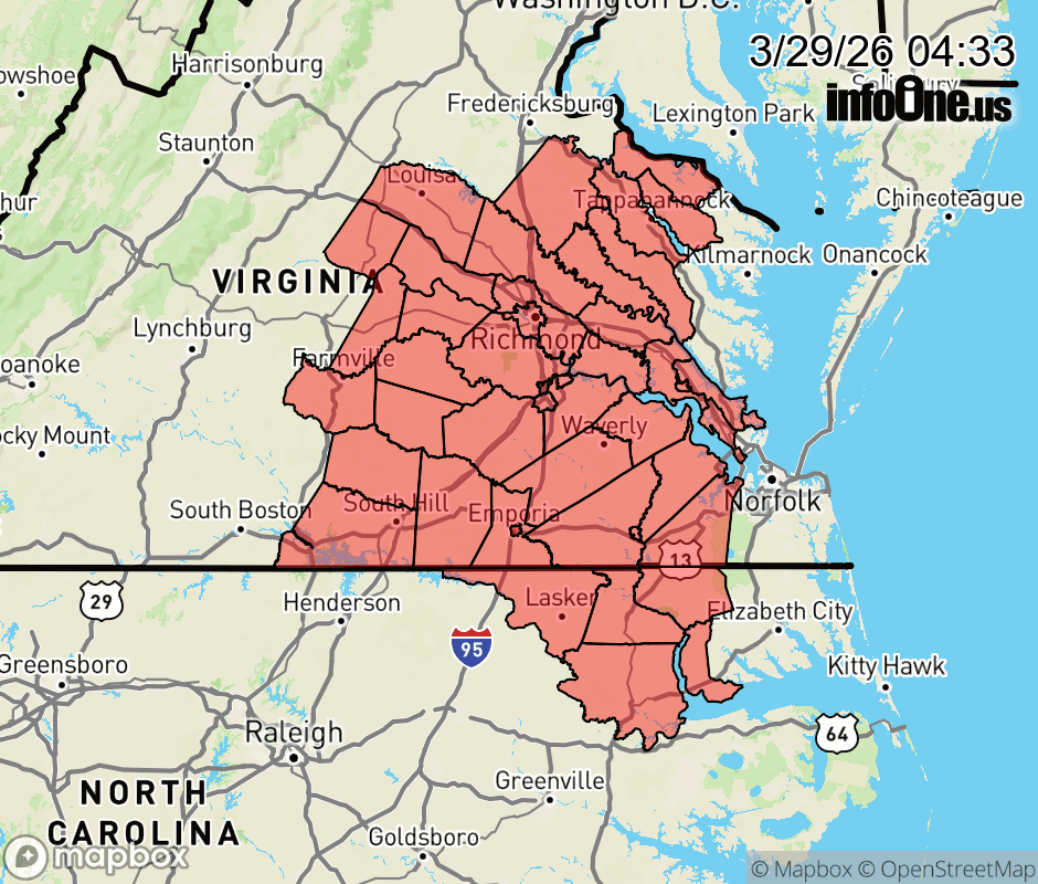 Special Weather Statement issued March 29 at 4:32AM EDT by NWS Wakefield VA The combination of relative humidity values in the 25 to 30 percent range, dry fine fuels, and wind gusts up to 15 mph will result in an increased risk for the rapid spread of wildfires this afternoon across central and inland eastern Virginia, and interior northeast North Carolina. Everyone is urged to properly dispose of cigarette butts, matches, and any other flammable items in appropriate containers. Additionally, exercise caution if operating any equipment that could create sparks, and keep vehicles off of dry grass. Most dry grasses, dead leaves, and other tree litter could easily ignite and spread fire quickly. A statewide burn ban issued by the North Carolina Forest Service is currently in place. All open burning is prohibited until further notice. ![]() |