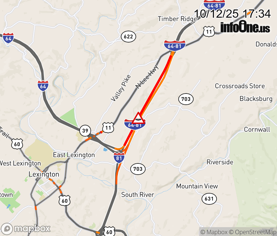 On I-81 at mile marker 192.6 in the County of Rockbridge, motorists can expect delays due to a tractor trailer crash. The south right shoulder is closed. Traffic backups are approximately 2.0 miles. ![]() |