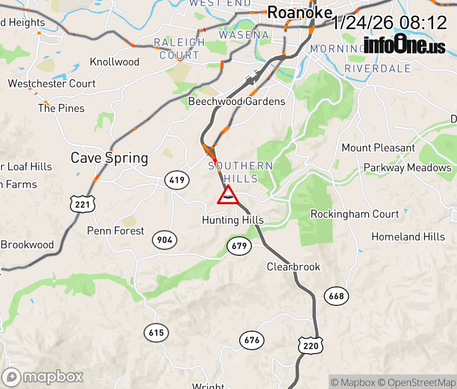 On US-220 in the County of Roanoke, in the vicinity of Crossbow Cir; Pheasant Ridge Rd; Rt. 1290N/S (Roanoke County), motorists can expect delays due to a tractor trailer crash. The south right lane and right shoulder are closed. Updated: Sat 1/24/26 8:12 AM EST ![]() Updated: Sat 1/24/26 8:12 AM EST |