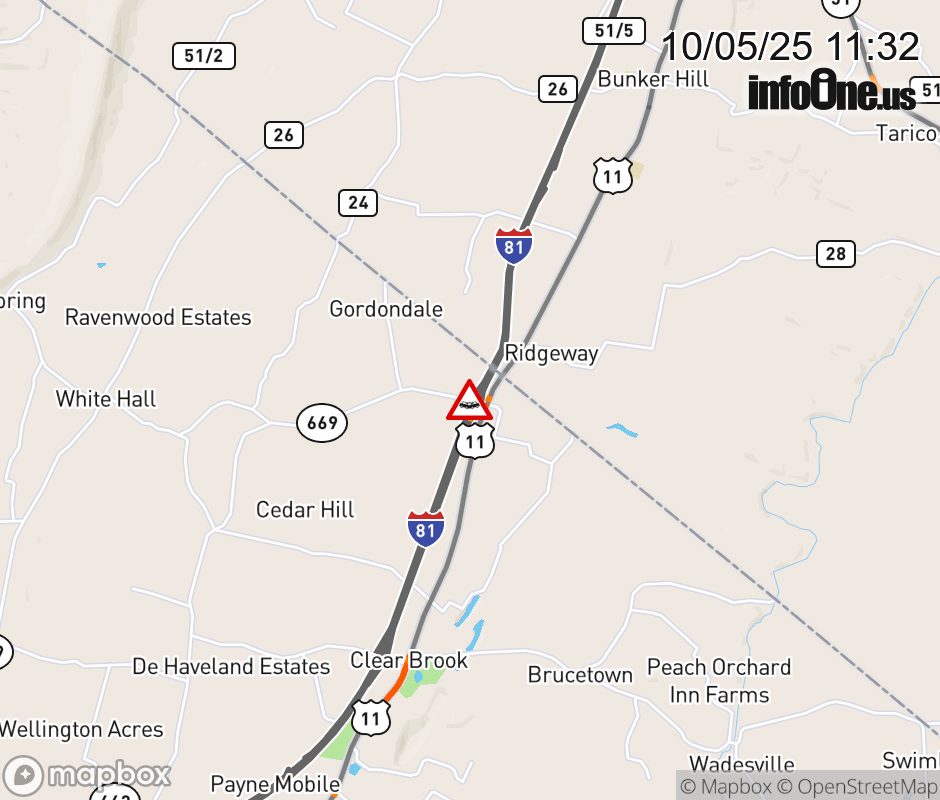 On Rt. 669 in the County of Frederick, in the vicinity of the ramp from and to I-81S, motorists can expect delays due to a vehicle crash. The west through lanes and right shoulder are closed. ![]() |