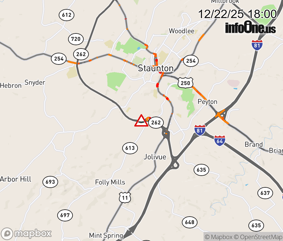 On VA-262 East in the County of Augusta, in the vicinity of the ramp to Middlebrook Road, motorists can expect delays due to a vehicle crash. Updated: Mon 12/22/25 6:00 PM EST ![]() Updated: Mon 12/22/25 6:00 PM EST |