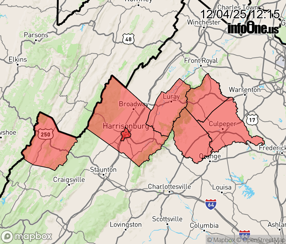 Canceled 12/4/25 1:58 PM Winter Weather Advisory issued December 4 at 12:13PM EST until December 5 at 4:00PM EST by NWS Baltimore MD/Washington DC * WHAT... Snow, with total accumulations of 1 to 3 inches. Localized totals around 4 inches are possible over the higher elevations of Augusta and Highland Counties. * WHERE... Portions of northern, northwest, and western Virginia. * WHEN... From 1 AM to 4 PM EST Friday. * IMPACTS... Plan on slippery road conditions. The hazardous conditions will impact the Friday morning commute. * ADDITIONAL DETAILS... Given temperatures will be in the 20s, snow is expected to accumulate on all untreated surfaces. A light snow will overspread the advisory area, with slightly higher amounts possible in any banding features. As snow winds down, a light freezing drizzle is possible into Friday evening. ![]() |