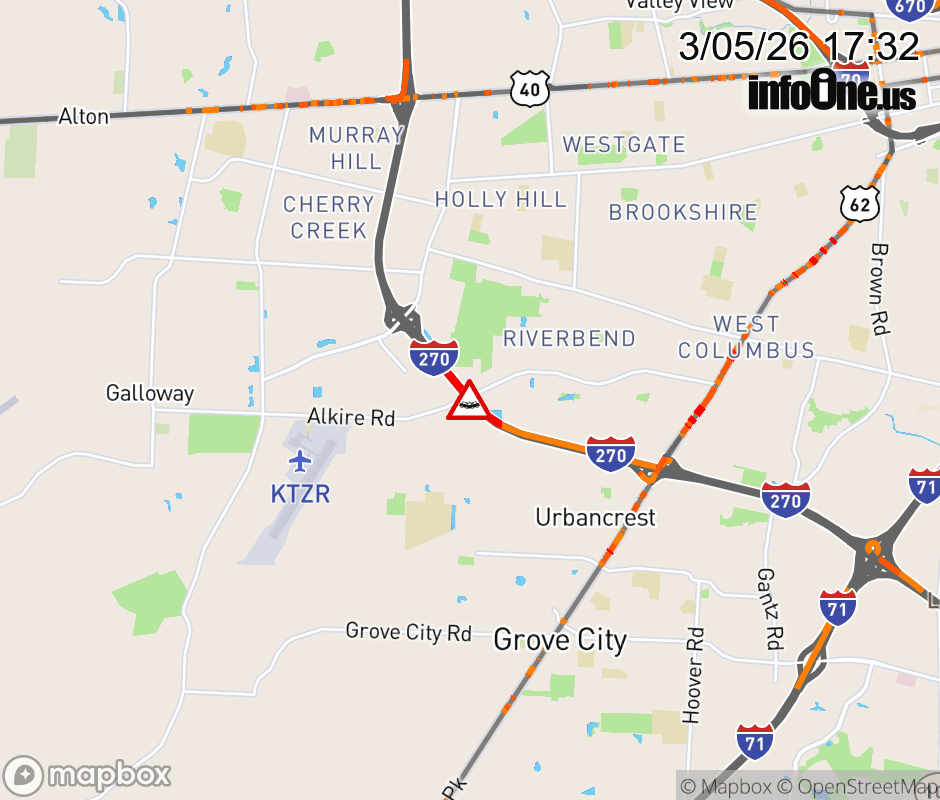 The 2 right lanes are blocked on I-270 West beyond US-62/Harrisburg Pike, due to a crash. ![]() |