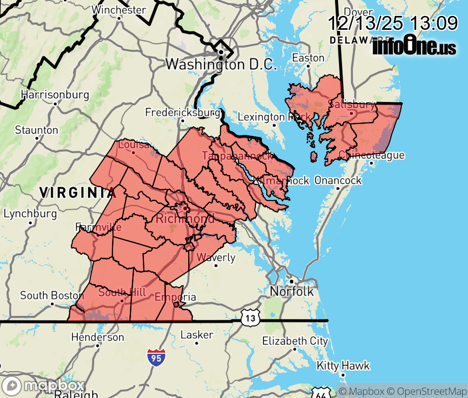 Canceled 12/13/25 9:47 PM Cold Weather Advisory issued December 13 at 1:08PM EST until December 15 at 9:00AM EST by NWS Wakefield VA * WHAT... Very cold wind chills as low as 4 above expected. * WHERE... Portions of southeast Maryland and central, east central, eastern, north central, south central, and southeast Virginia. * WHEN... From 7 PM Sunday to 9 AM EST Monday. * IMPACTS... Very cold temperatures and wind chills could lead to hypothermia with prolonged exposure. ![]() |