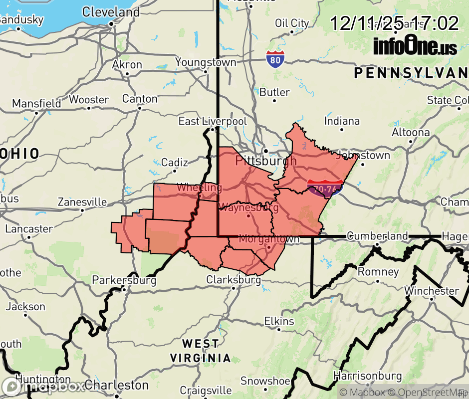 Canceled 12/11/25 6:46 PM Winter Storm Watch issued December 11 at 5:00PM EST until December 14 at 1:00PM EST by NWS Pittsburgh PA * WHAT... Heavy snow possible. Total snow accumulations between 3 and 7 inches with locally higher amounts possible. * WHERE... Portions of east central Ohio, southwest and western Pennsylvania, and northern and the northern panhandle of West Virginia. * WHEN... From Saturday afternoon through Sunday afternoon. * IMPACTS... Plan on slippery road conditions. ![]() |