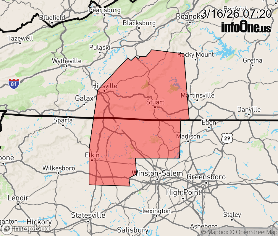 Canceled 3/16/26 8:00 AM Special Weather Statement issued March 16 at 7:19AM EDT by NWS Blacksburg VA At 715 AM EDT, radar was tracking a cluster of strong thunderstorms between Hillsville, Virginia, and Yadkinville, North Carolina, moving northeast at 40 mph. Wind gusts up to 50 mph and pea size hail are possible with this storm along with very heavy rain. Locations impacted include... Mount Airy... Elkin... Fairview... Flat Rock... Yadkinville... Hillsville... and Jonesville. Torrential rainfall may cause localized flooding. Do not drive your vehicle through flooded roadways. Storms may intensify, so be certain to monitor local radio stations and available television stations for additional information and possible warnings from the National Weather Service. ![]() |