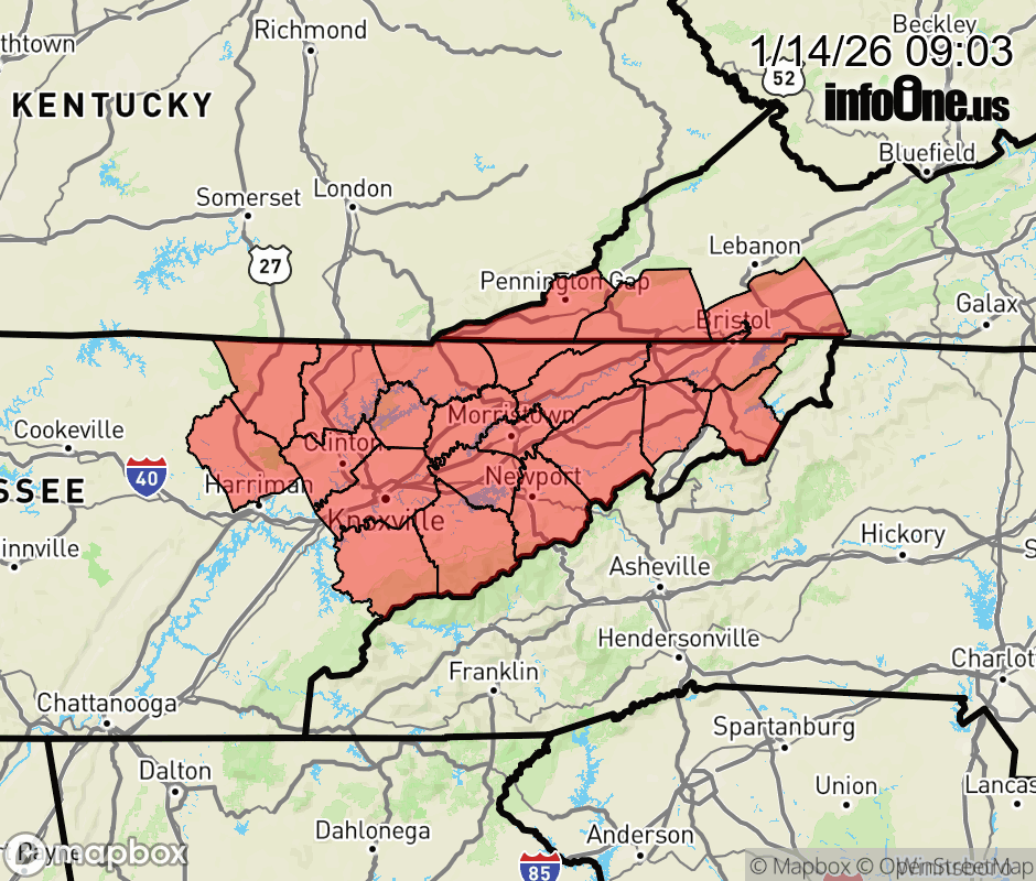Canceled 1/14/26 2:15 PM Special Weather Statement issued January 14 at 9:01AM EST by NWS Morristown TN A cold front will move across east Tennessee, southwest Virginia, and southwest North Carolina late this afternoon and evening bringing with it widespread precipitation and colder temperatures. A band of rain will move into the region then mix with and change over to snow during the evening. A brief period of accumulating snow is possible across the Plateau, southwest Virginia, northeast Tennessee, and central valley. Snowfall of a dusting to 1/2 inch is possible mainly on grassy and elevated surfaces, and up to 1 inch across the higher ridges. Snow covered roadways are possible especially across the higher terrain this evening into tonight. Stay tuned to NOAA Weather Radio and other local media for further details or updates. ![]() |