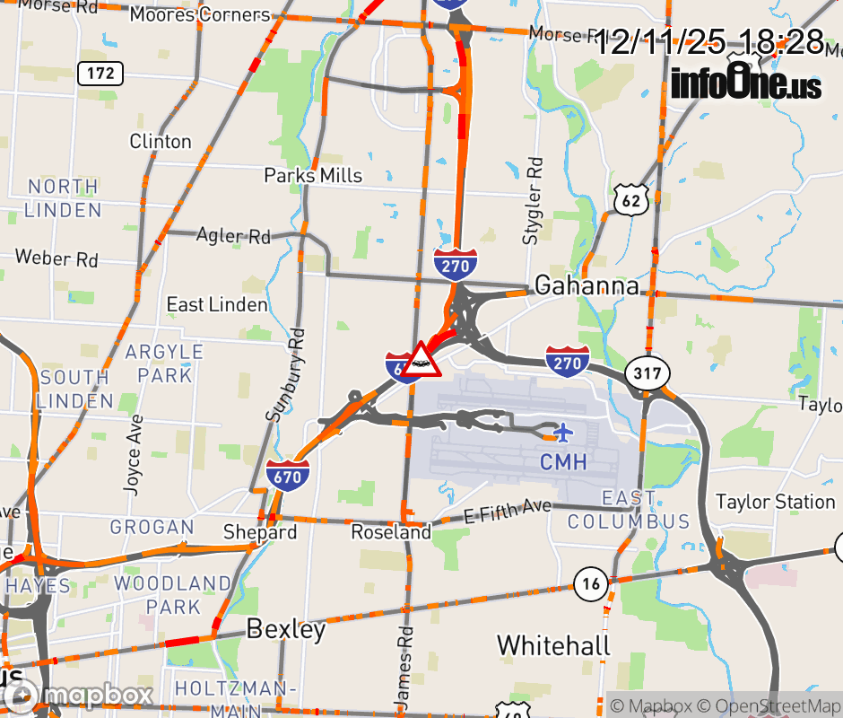 The left shoulder is blocked on I-670/US-62 West at Ramp I-270 North to Airport/Stelzer Rd, due to a crash. ![]() |
