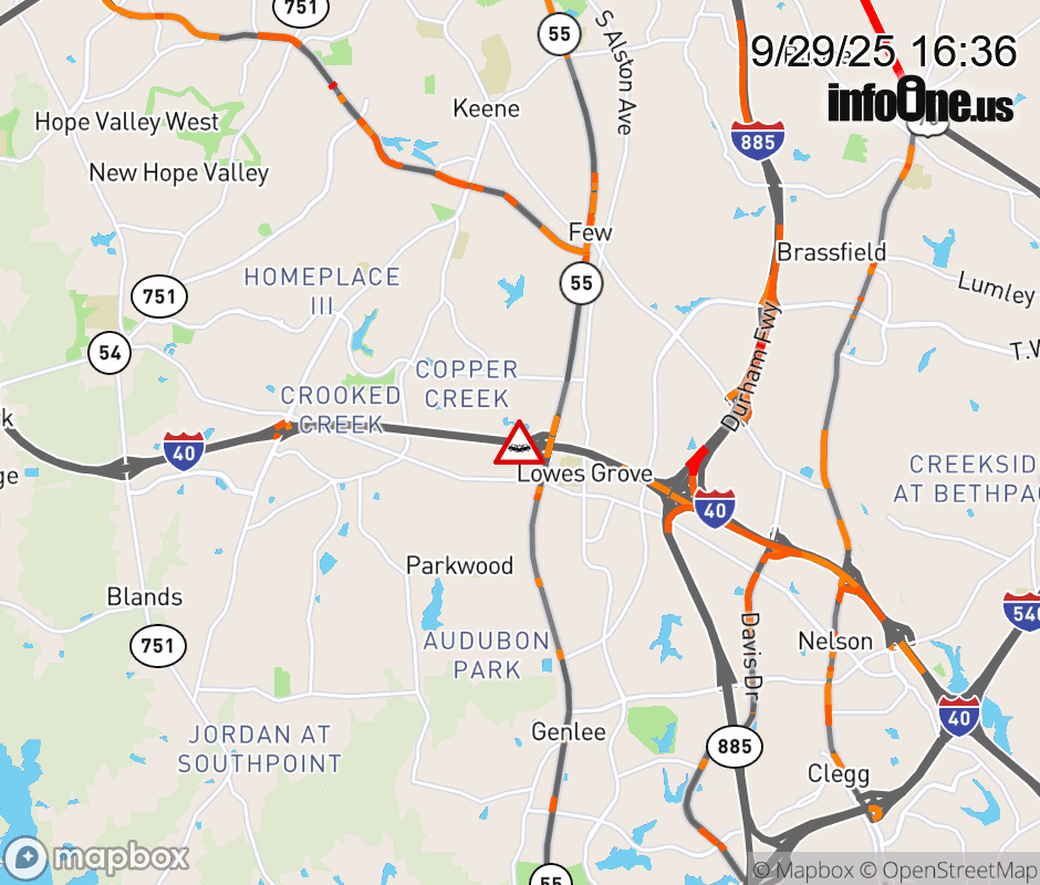 The left shoulder is closed near Exit 278 (NC 55). ![]() |