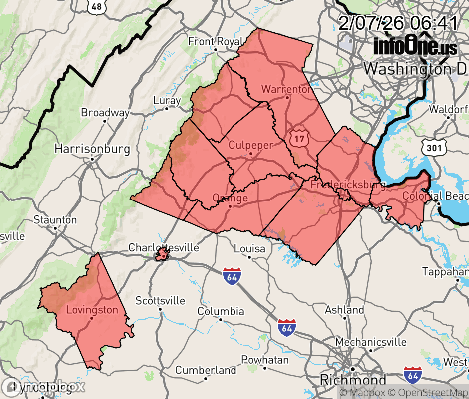 Canceled 2/7/26 12:09 PM Cold Weather Advisory issued February 7 at 6:40AM EST until February 8 at 10:00AM EST by NWS Baltimore MD/Washington DC * WHAT... For the Cold Weather Advisory, very cold wind chills as low as 9 below. For the Wind Advisory, northwest winds 15 to 25 mph with gusts up to 55 mph. * WHERE... Portions of central, northern, and northwest Virginia. * WHEN... For the Cold Weather Advisory, until 10 AM EST Sunday. For the Wind Advisory, until 7 PM EST this evening. * IMPACTS... Gusty winds will blow around unsecured objects. Tree limbs could be blown down and a few power outages may result. The cold wind chills as low as 10 below zero could result in hypothermia if precautions are not taken. ![]() |