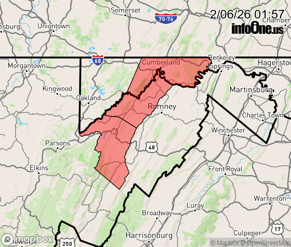Canceled 2/6/26 2:21 AM High Wind Warning issued February 6 at 1:55AM EST until February 7 at 7:00PM EST by NWS Baltimore MD/Washington DC * WHAT... For the High Wind Warning, northwest winds 20 to 30 mph with gusts up to 60 mph expected. For the Cold Weather Advisory, very cold wind chills as low as 15 below zero expected. * WHERE... In Maryland, Central and Eastern Allegany County. In West Virginia, Eastern Grant and Eastern Mineral Counties. * WHEN... For the High Wind Warning, from 4 AM to 7 PM EST Saturday. For the Cold Weather Advisory, from 4 AM Saturday to 10 AM EST Monday. * IMPACTS... Damaging winds will blow down trees and power lines. Power outages are expected. Travel will be difficult, especially for high profile vehicles. The cold wind chills could result in hypothermia or frostbite if precautions are not taken. * ADDITIONAL DETAILS... Wind chills will remain at or below zero during the day on Saturday due to windy conditions and cold temperatures. ![]() |