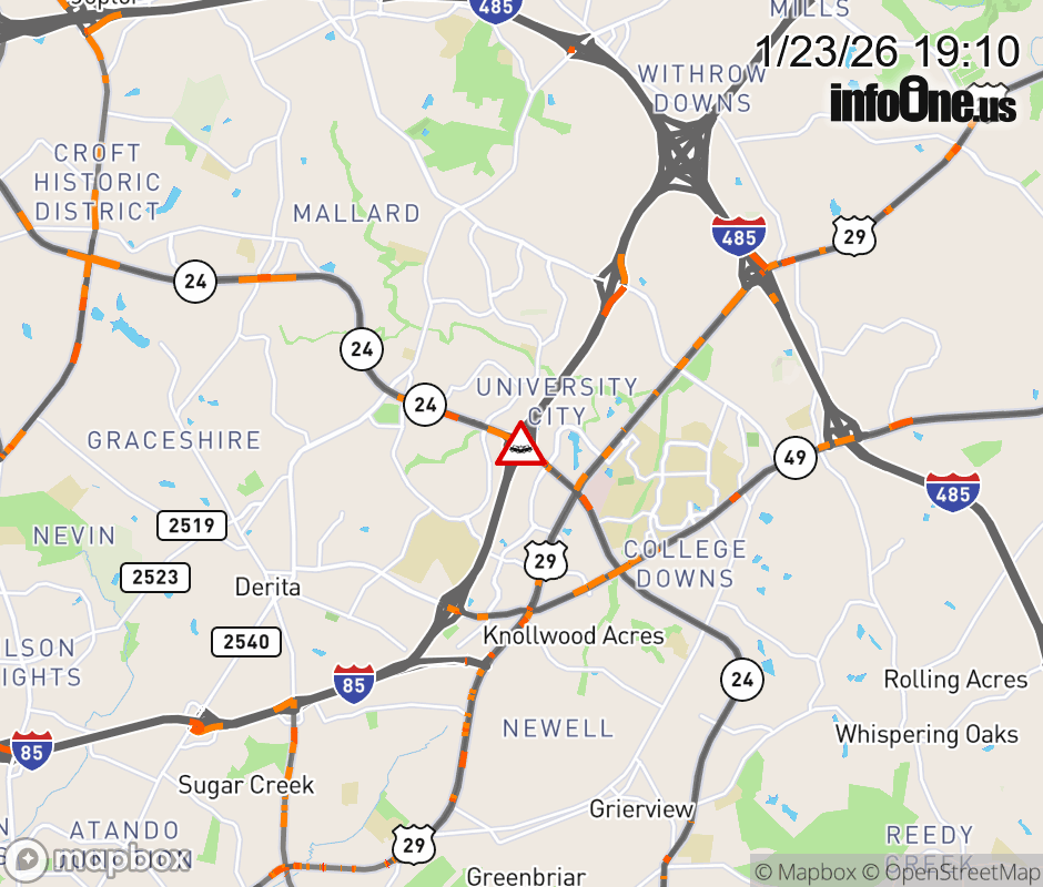 The right shoulder of the exit ramp lane is closed at Exit 45B(W.T. Harris Blvd). Updated: Fri 1/23/26 7:10 PM EST ![]() Updated: Fri 1/23/26 7:10 PM EST |