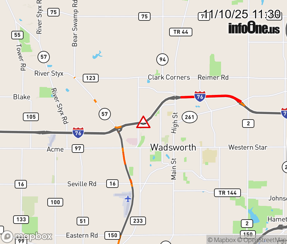 The right lane is blocked on I-76/US-224 West beyond SR-94, due to a crash. Updated: Mon 11/10/25 11:30 AM EST ![]() Updated: Mon 11/10/25 11:30 AM EST |