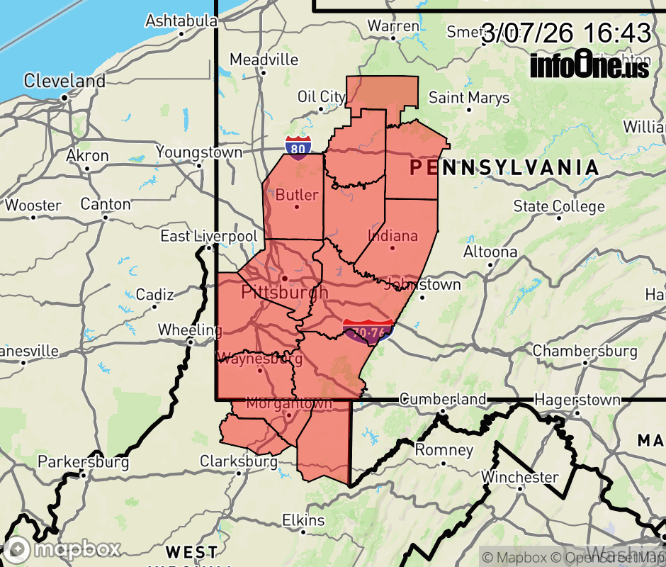 Canceled 3/7/26 5:10 PM Tornado Watch issued March 7 at 4:41PM EST until March 7 at 8:00PM EST by NWS Pittsburgh PA TORNADO WATCH 25 REMAINS VALID UNTIL 8 PM EST THIS EVENING FOR THE FOLLOWING AREAS IN PENNSYLVANIA THIS WATCH INCLUDES 11 COUNTIES IN NORTHWEST PENNSYLVANIA FOREST IN SOUTHWEST PENNSYLVANIA ALLEGHENY FAYETTE GREENE WASHINGTON WESTMORELAND IN WEST CENTRAL PENNSYLVANIA ARMSTRONG BUTLER CLARION INDIANA JEFFERSON PA IN WEST VIRGINIA THIS WATCH INCLUDES 3 COUNTIES IN NORTHEAST WEST VIRGINIA PRESTON IN NORTHERN WEST VIRGINIA MARION MONONGALIA THIS INCLUDES THE CITIES OF BROOKVILLE, BUTLER, CANONSBURG, CLARION, CONNELLSVILLE, FAIRMONT, FORD CITY, GREENSBURG, INDIANA, KINGWOOD, KITTANNING, LATROBE, MASONTOWN, MORGANTOWN, MURRYSVILLE, NEW KENSINGTON, PITTSBURGH METRO AREA, PUNXSUTAWNEY, TERRA ALTA, TIONESTA, UNIONTOWN, WASHINGTON, AND WAYNESBURG. ![]() |