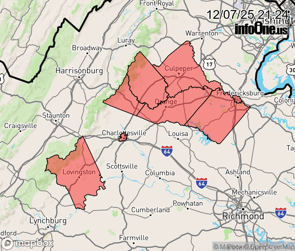 Canceled 12/8/25 4:00 AM Freezing Fog Advisory issued December 7 at 9:22PM EST until December 8 at 4:00AM EST by NWS Baltimore MD/Washington DC * WHAT... Visibility one quarter mile or less in freezing fog. * WHERE... Albemarle, Greene, Nelson, Orange, Spotsylvania, Culpeper, and Madison Counties. * WHEN... Until 4 AM EST Monday. * IMPACTS... Low visibility could make driving conditions hazardous. Dense fog with sub-freezing temperatures could cause surfaces to quickly become slick. ![]() |