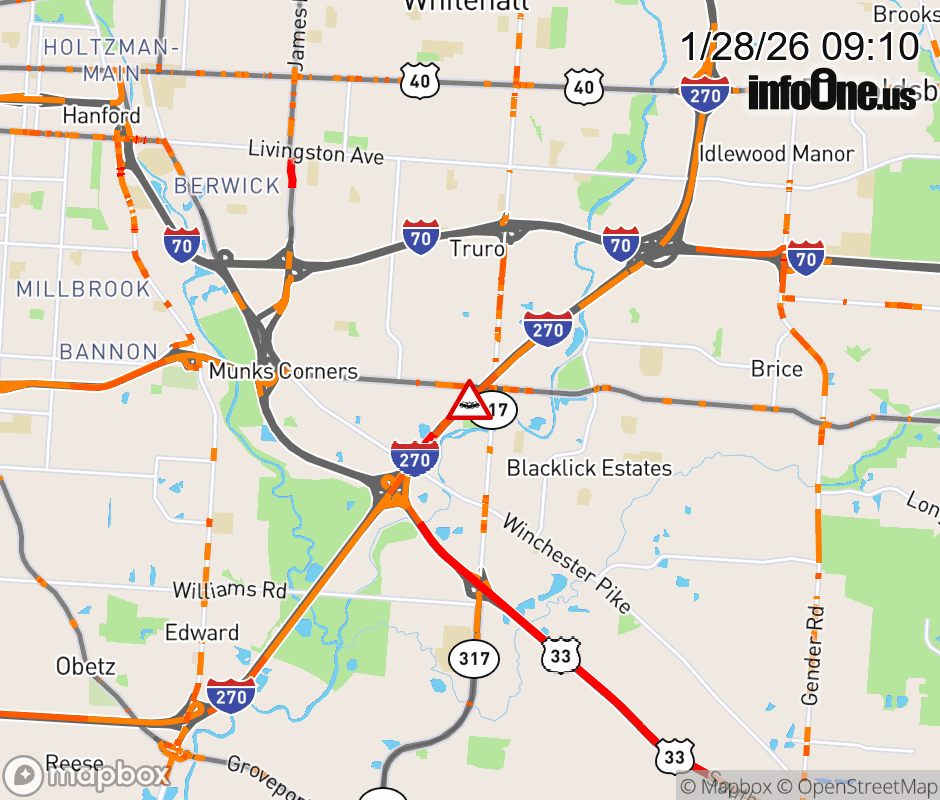 The left lane is blocked on I-270 North beyond US-33, due to a crash. ![]() |