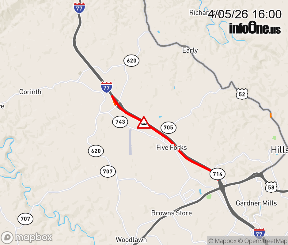 On I-77 at mile marker 18.2 in the County of Carroll, motorists can expect delays due to a vehicle crash. The south left shoulder and left lane are closed. ![]() |