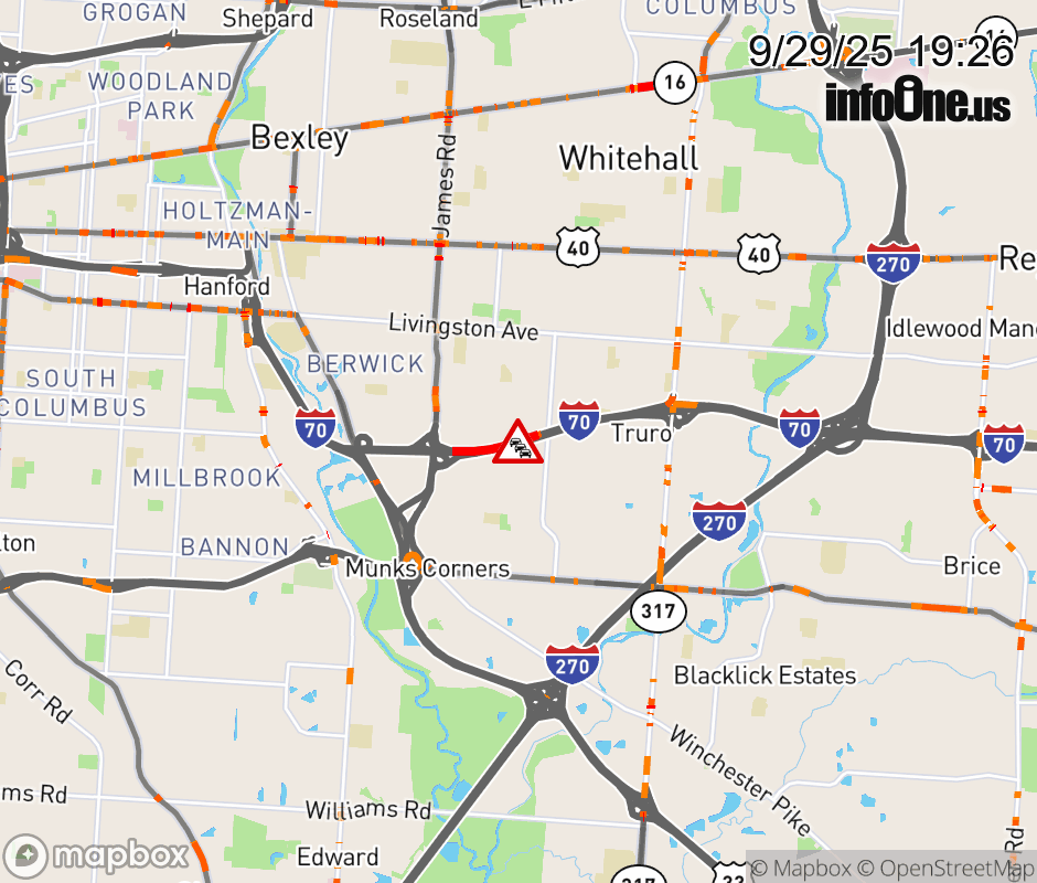 The right lane is blocked on I-70 West beyond SR-317/Hamilton Rd, due to repairs/maintenance. ![]() |