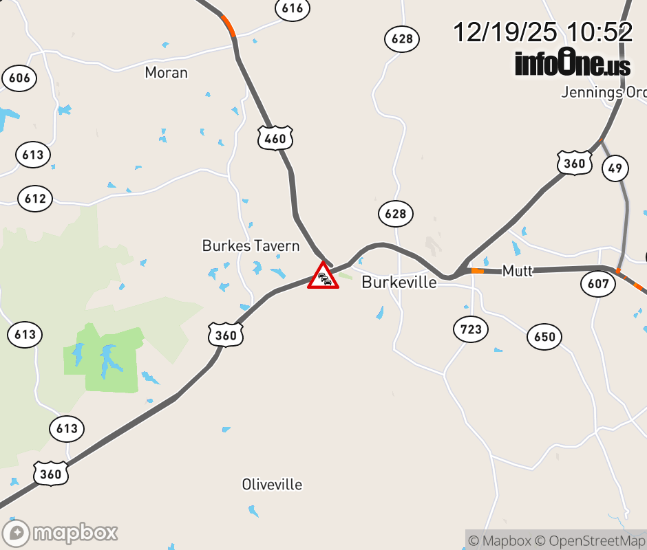 On US-360 East in the County of Nottoway, in the vicinity of Burkes Tavern Rd; Rt. 621E/W (Nottoway County), motorists can expect delays due to weather. Updated: Fri 12/19/25 10:52 AM EST ![]() Updated: Fri 12/19/25 10:52 AM EST |