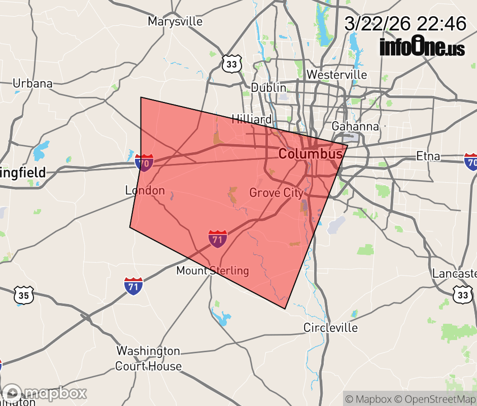 Canceled 3/22/26 11:00 PM Severe Thunderstorm Warning issued March 22 at 10:45PM EDT until March 22 at 11:15PM EDT by NWS Wilmington OH At 1045 PM EDT, a severe thunderstorm was located near West Jefferson, moving east at 50 mph. HAZARD...60 mph wind gusts and half dollar size hail. SOURCE...Radar indicated. IMPACT...Minor hail damage to vehicles is possible. Expect wind damage to trees and power lines. Locations impacted include... Columbus, Grove City, Upper Arlington, Hilliard, Bexley, London, Jefferson, West Jefferson, Mount Sterling, Ohio State University, Lake Darby, Whitehall, Grandview Heights, Obetz, Commercial Point, Urbancrest, Valleyview, Marble Cliff, Lafayette, and Harrisburg. This includes the following Interstates... I-70 in Ohio between mile markers 75 and 104. I-71 in Ohio between mile markers 83 and 110. ![]() |