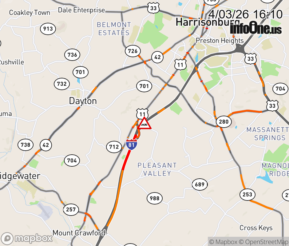 On I-81 at mile marker 243.6 in the County of Rockingham, motorists can expect delays due to a disabled vehicle. The north right shoulder is closed. Traffic backups are approximately 2.5 miles. Updated: Fri 4/3/26 4:10 PM EDT ![]() |