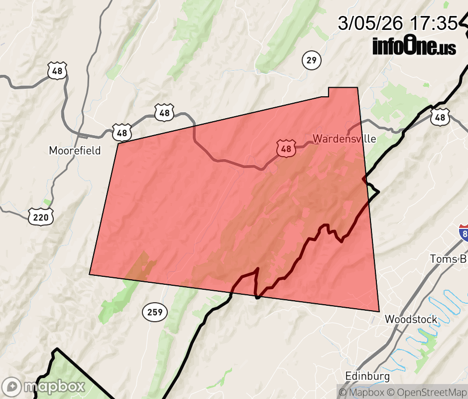 Canceled 3/5/26 5:46 PM Severe Thunderstorm Warning issued March 5 at 5:34PM EST until March 5 at 6:00PM EST by NWS Baltimore MD/Washington DC At 534 PM EST, a severe thunderstorm was located 10 miles east of Moorefield, moving east at 35 mph. HAZARD...60 mph wind gusts and quarter size hail. SOURCE...Radar indicated. IMPACT...Damaging winds will cause some trees and large branches to fall. This could injure those outdoors, as well as damage homes and vehicles. Roadways may become blocked by downed trees. Localized power outages are possible. Unsecured light objects may become projectiles. Locations impacted include... Wardensville, Lost City, Perry, Lost River, Baker, and Mccauley. ![]() |
