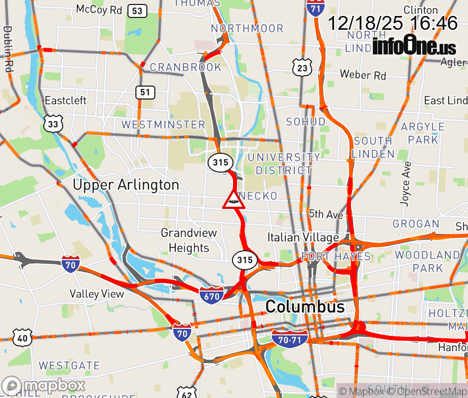 The right shoulder is blocked on SR-315 North at Medical Cntr Dr/King Ave, due to a crash. Updated: Thu 12/18/25 4:46 PM EST ![]() Updated: Thu 12/18/25 4:46 PM EST |