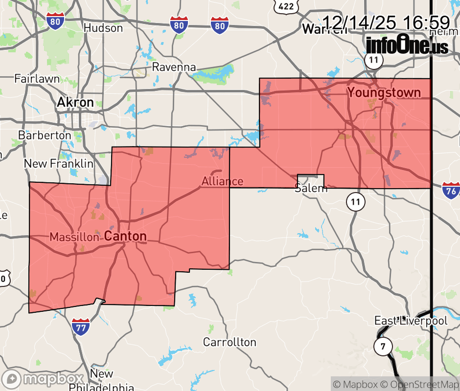 Canceled 12/14/25 7:00 PM Winter Weather Advisory issued December 14 at 4:57PM EST until December 14 at 7:00PM EST by NWS Cleveland OH * WHAT... Snow. Additional snow accumulations up to one inch. * WHERE... Mahoning and Stark Counties. * WHEN... Until 7 PM EST this evening. * IMPACTS... Plan on slippery road conditions. ![]() |