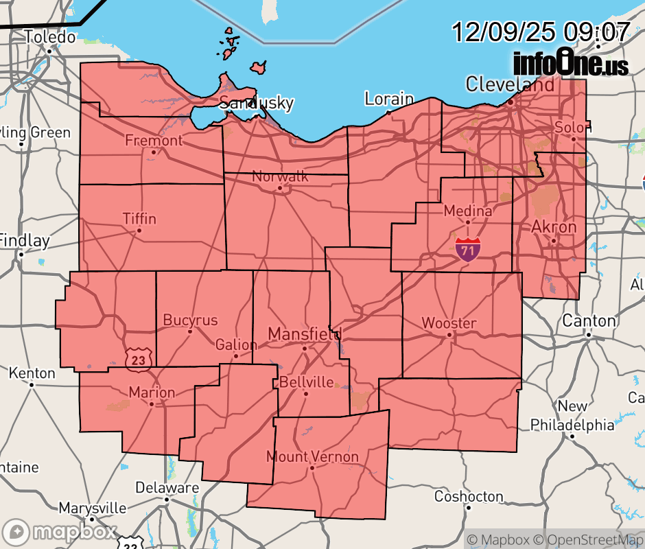 Canceled 12/9/25 11:15 AM Special Weather Statement issued December 9 at 9:06AM EST by NWS Cleveland OH A line of snow will move rapidly east over the next few hours. The snow will be moderate to briefly heavy, with a quick coating of snow on roads and visibilities falling to a half mile or less at times. Expect rapid changes in road and visibility conditions if traveling this morning. ![]() |