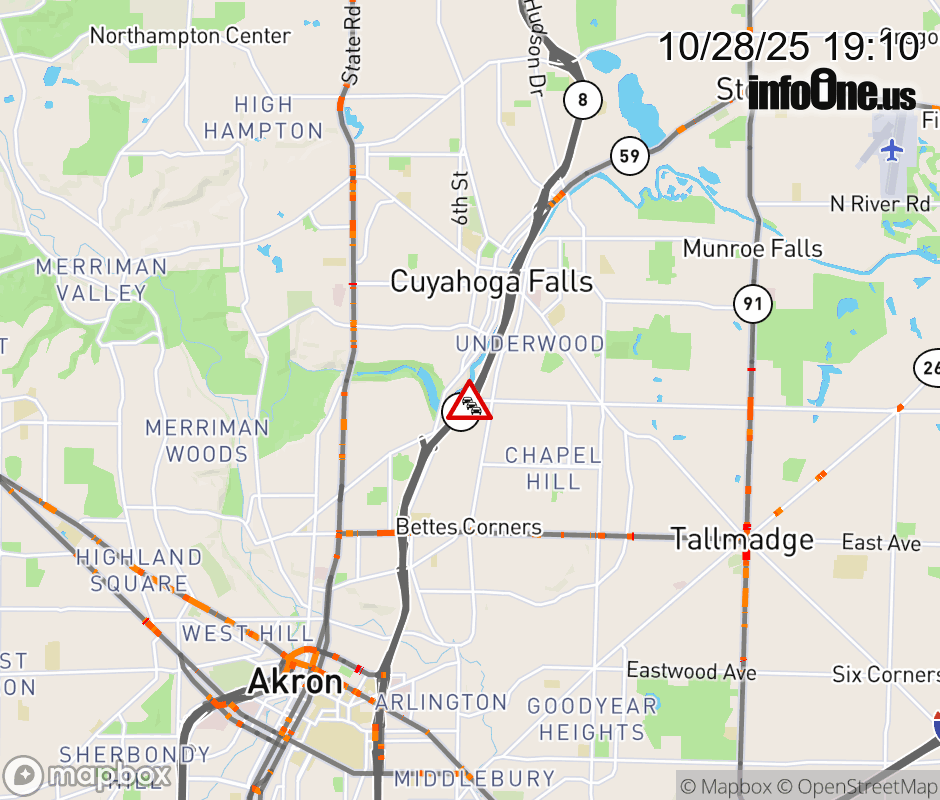 The right lane is blocked on SR-8 South/SR-59 West at Howe Ave/Cuyahoga Falls Ave, due to repairs/maintenance. ![]() |