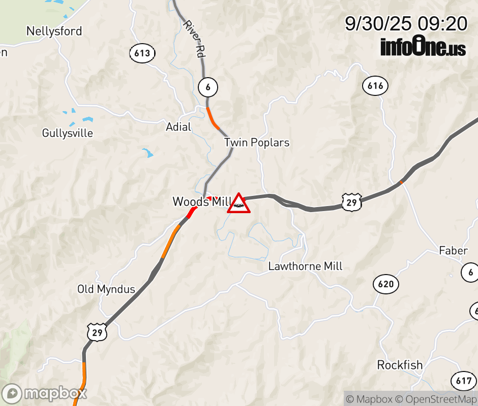 On US-29 North in the County of Nelson, in the vicinity of River View Ln; Rt. 828N/S (Nelson County), motorists can expect delays due to a vehicle crash. Lane closures exist. ![]() |