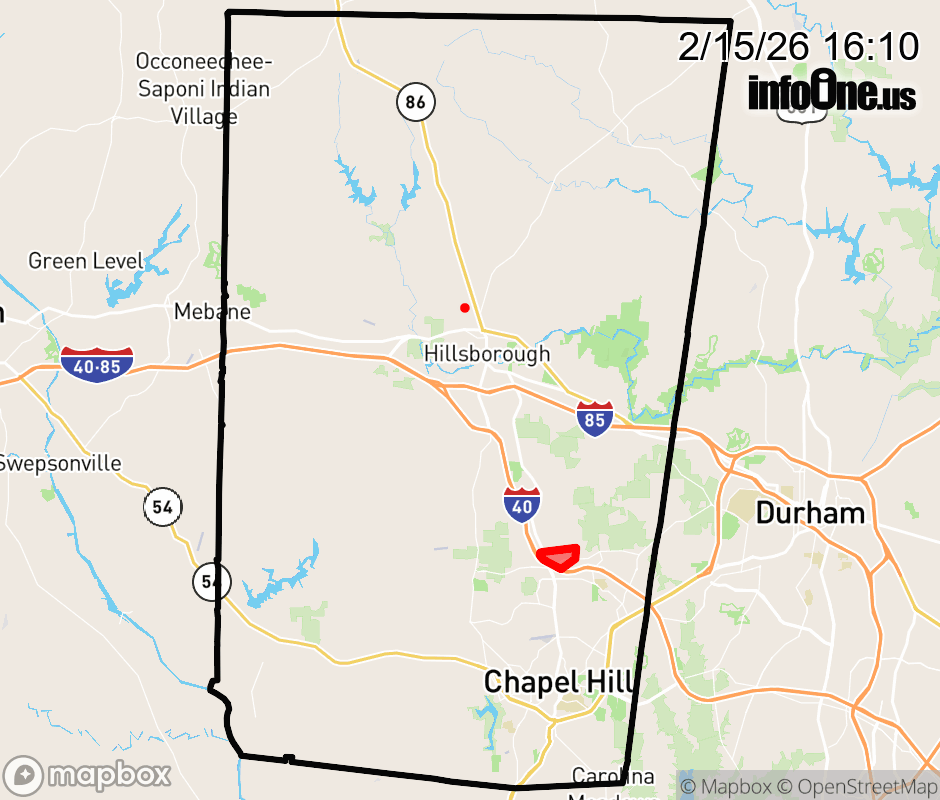 Canceled 2/15/26 4:40 PM Orange County has 2 power outages affecting 86 customers. Duke Energy 86 without power Estimated repair: Sun 5:45 PM Updated: Sun 2/15/26 4:10 PM EST ![]() Updated: Sun 2/15/26 4:10 PM EST |