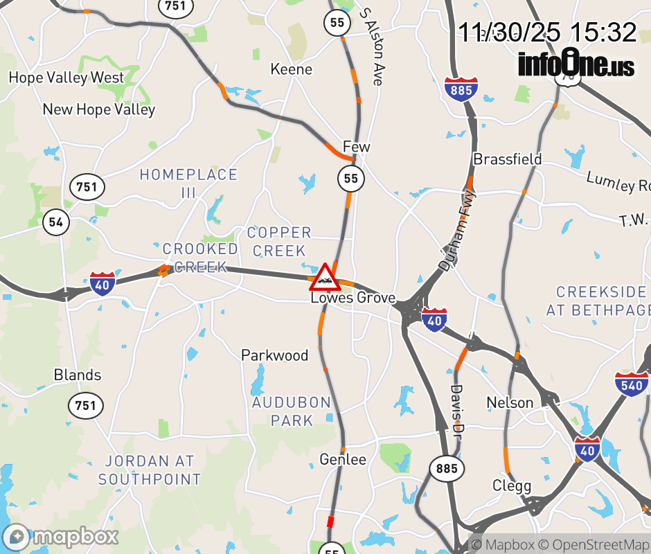 The middle ramp lane is closed on Exit 278 (NC-55). Updated: Sun 11/30/25 3:30 PM EST ![]() Updated: Sun 11/30/25 3:32 PM EST |