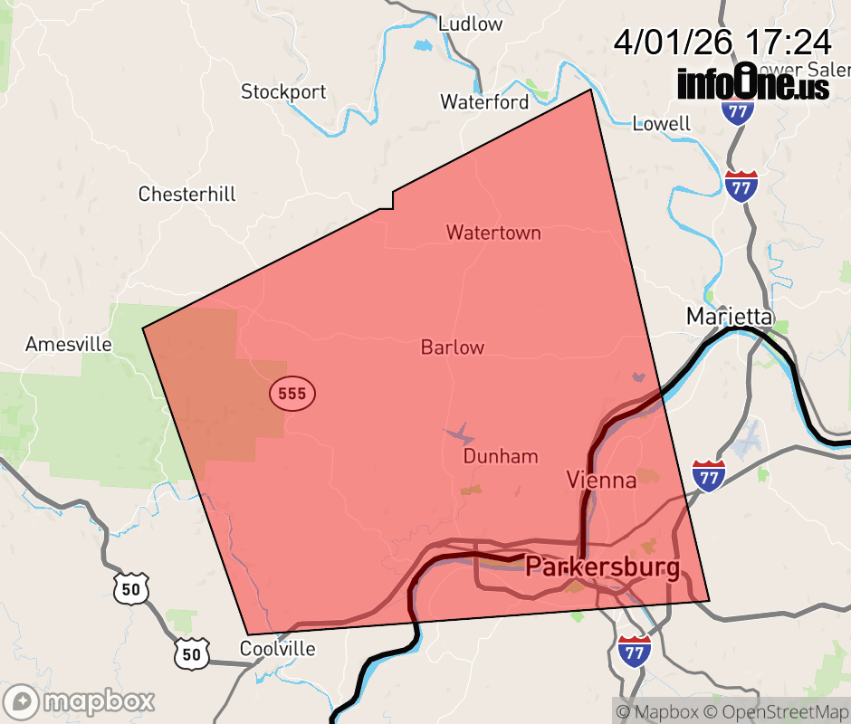 Canceled 4/1/26 5:49 PM Severe Thunderstorm Warning issued April 1 at 5:23PM EDT until April 1 at 6:00PM EDT by NWS Charleston WV SVRRLX The National Weather Service in Charleston West Virginia has issued a * Severe Thunderstorm Warning for... Southwestern Washington County in southeastern Ohio... Southeastern Athens County in southeastern Ohio... Northwestern Wood County in northwestern West Virginia... * Until 600 PM EDT. * At 523 PM EDT, a severe thunderstorm was located 9 miles north of Coolville, moving east at 30 mph. HAZARD...60 mph wind gusts and quarter size hail. SOURCE...Radar indicated. IMPACT...Hail damage to vehicles is expected. Expect wind damage to roofs, siding, and trees. * Locations impacted include... Parkersburg, Belpre, Vienna, Washington, Boaz, North Hills, Fleming, Blennerhassett, Bartlett, and Little Hocking. This includes the following highways... Interstate 77 in West Virginia between mile markers 176 and 179. Route 50 in West Virginia between mile markers 1 and 11. ![]() |
