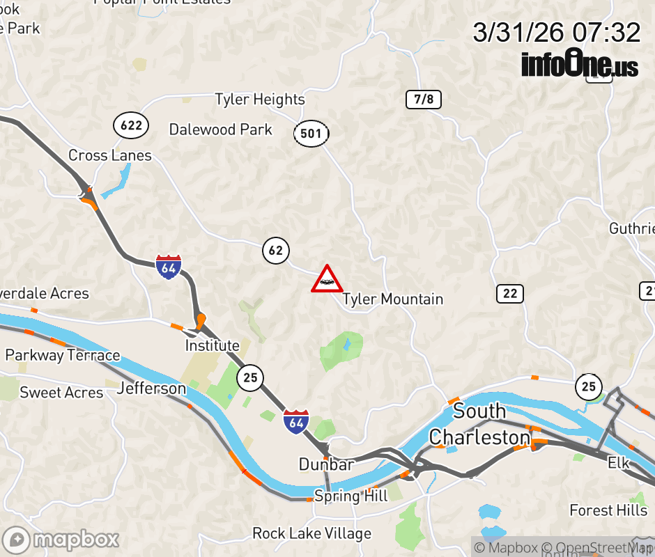 Vehicle Crash on WV-62 (Washington St W) & CR-25/25 (Dutch Hollow Rd) in Tyler Mountain. Updated: Tue 3/31/26 7:32 AM EDT ![]() Updated: Tue 3/31/26 7:32 AM EDT |