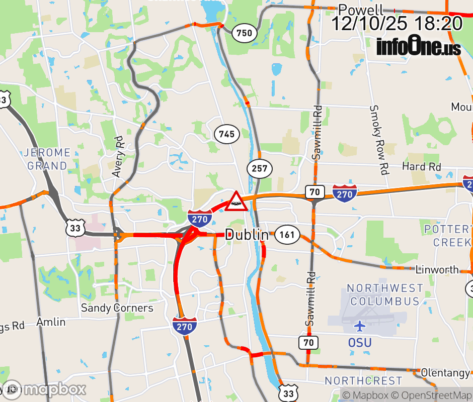 The left lane is blocked on I-270 East beyond US-33/SR-161, due to a crash. Updated: Wed 12/10/25 6:20 PM EST ![]() Updated: Wed 12/10/25 6:20 PM EST |