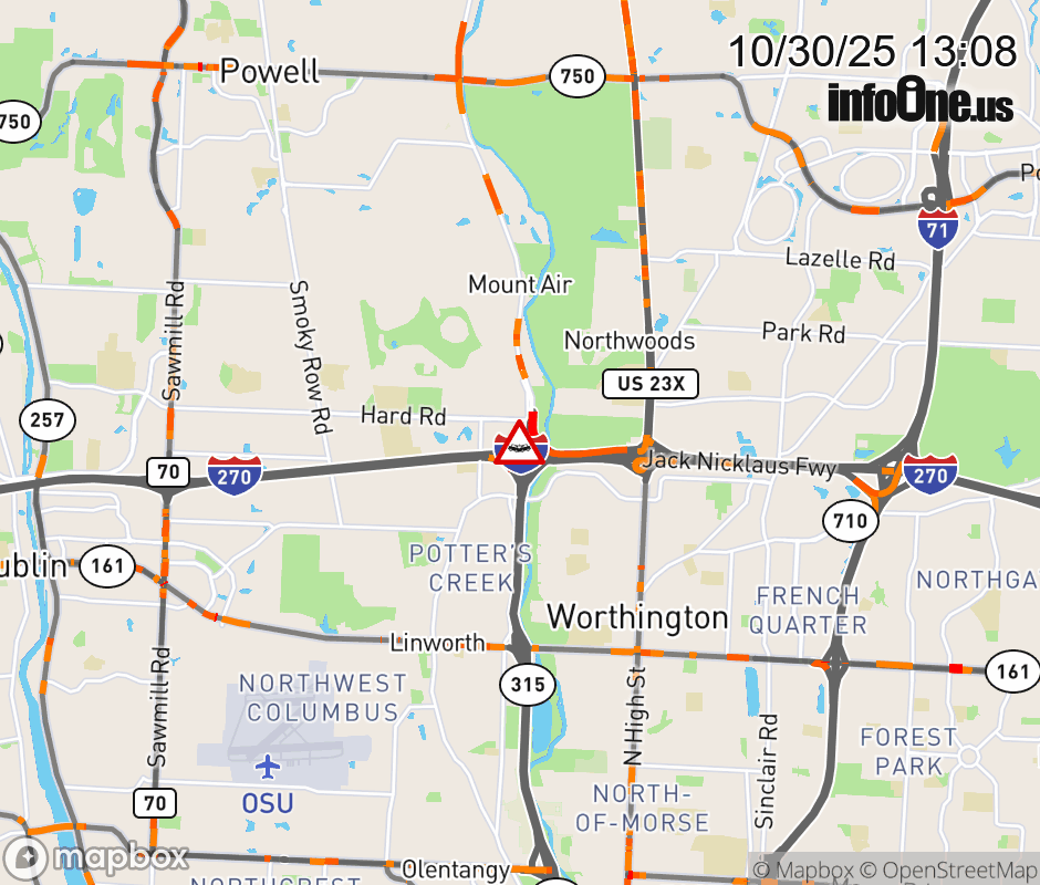 The left lane is blocked on Ramp I-270 West to SR-315 South, due to a crash. Updated: Thu 10/30/25 1:08 PM EDT ![]() Updated: Thu 10/30/25 1:08 PM EDT |