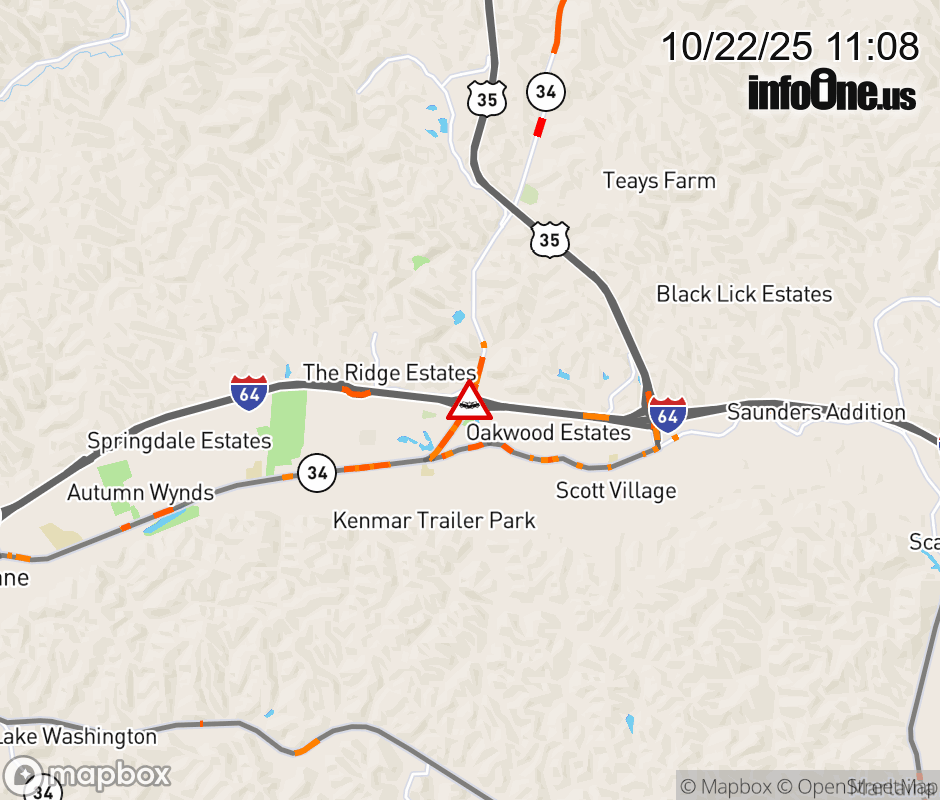 Vehicle Crash on WV-34 at I-64 WB Ramps. The northbound left lane is closed. Updated: Wed 10/22/25 11:08 AM EDT ![]() Updated: Wed 10/22/25 11:08 AM EDT |