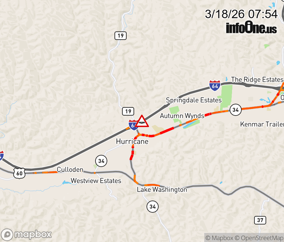 Vehicle Crash on I-64W at Mile Marker 34.0. The westbound right lane is closed. Updated: Wed 3/18/26 7:54 AM EDT ![]() Updated: Wed 3/18/26 7:54 AM EDT |