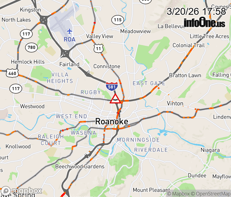 On I-581 at mile marker 1.2 in the County of Roanoke, motorists can expect delays due to a vehicle crash. The south right shoulder is closed. Updated: Fri 3/20/26 5:58 PM EDT ![]() Updated: Fri 3/20/26 5:58 PM EDT |