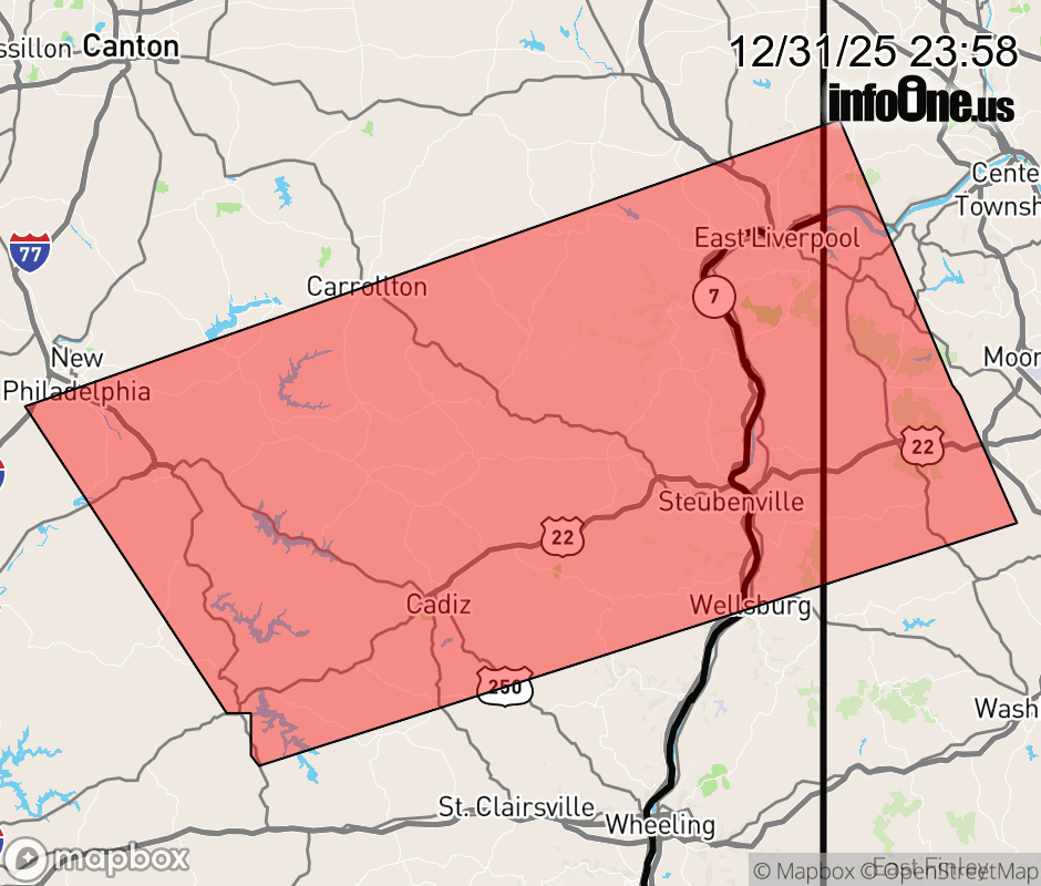Canceled 1/1/26 12:18 AM Snow Squall Warning issued December 31 at 11:57PM EST until January 1 at 12:45AM EST by NWS Pittsburgh PA The National Weather Service in Pittsburgh has issued a * Snow Squall Warning for... Northwestern Belmont County in east central Ohio... Southern Carroll County in east central Ohio... Southeastern Columbiana County in east central Ohio... Harrison County in east central Ohio... Jefferson OH County in east central Ohio... Southeastern Tuscarawas County in east central Ohio... Northwestern Washington County in southwestern Pennsylvania... Southwestern Beaver County in western Pennsylvania... Brooke County in northern West Virginia... Hancock County in northern West Virginia... * Until 1245 AM EST. * At 1157 PM EST, a dangerous snow squall was located along a line from over Ohioville to near Uhrichsville, or along a line from near East Liverpool to near Uhrichsville, moving south at 30 mph. HAZARD...Intense bursts of heavy snow and gusty winds leading to blowing snow and rapidly falling visibility. Wind gusts up to 30 mph. SOURCE...Radar indicated. IMPACT...Travel will become difficult and potentially dangerous within minutes. * Locations impacted include... Weirton, Steubenville, New Philadelphia, East Liverpool, Uhrichsville, Wellsville, Cadiz, Carrollton, Wellsburg, Freeport, Toronto, Calcutta, Wintersville, Ohioville, Mingo Junction, Follansbee, Dennison, Midland, Hooverson Heights and Chester. This includes Interstate 77 in Ohio near mile marker 78. ![]() |