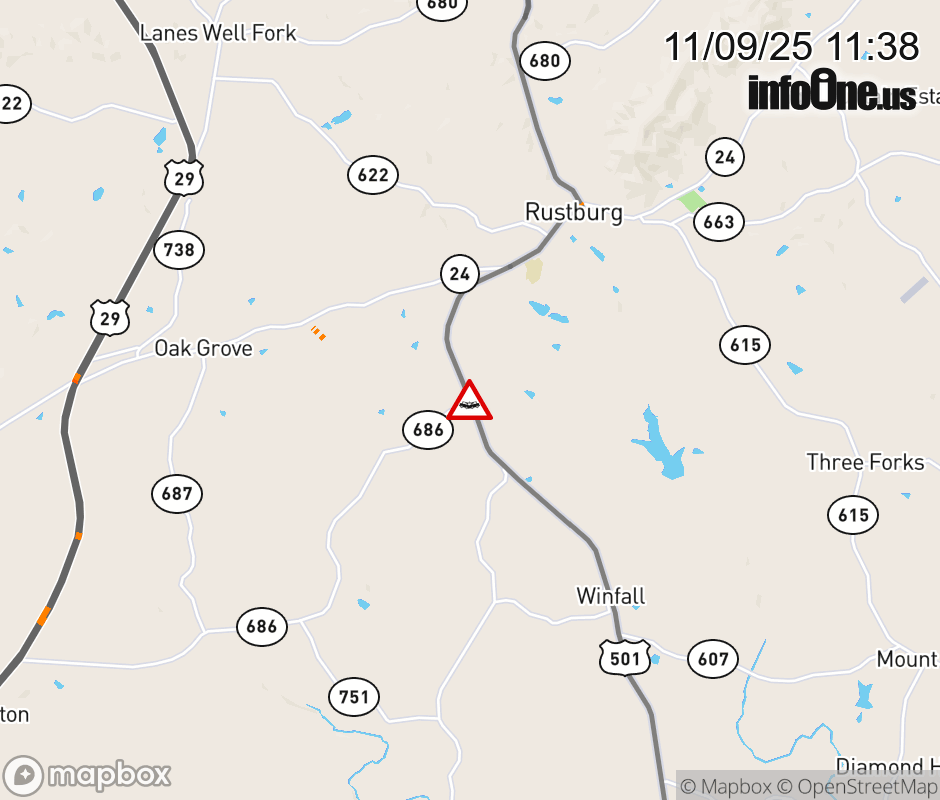 On US-501 North in the County of Campbell, in the vicinity of Alexander Ln; Browns Mill Rd; Rt. 686E/W (Campbell County), motorists can expect delays due to a vehicle crash. Lane closures exist. ![]() |