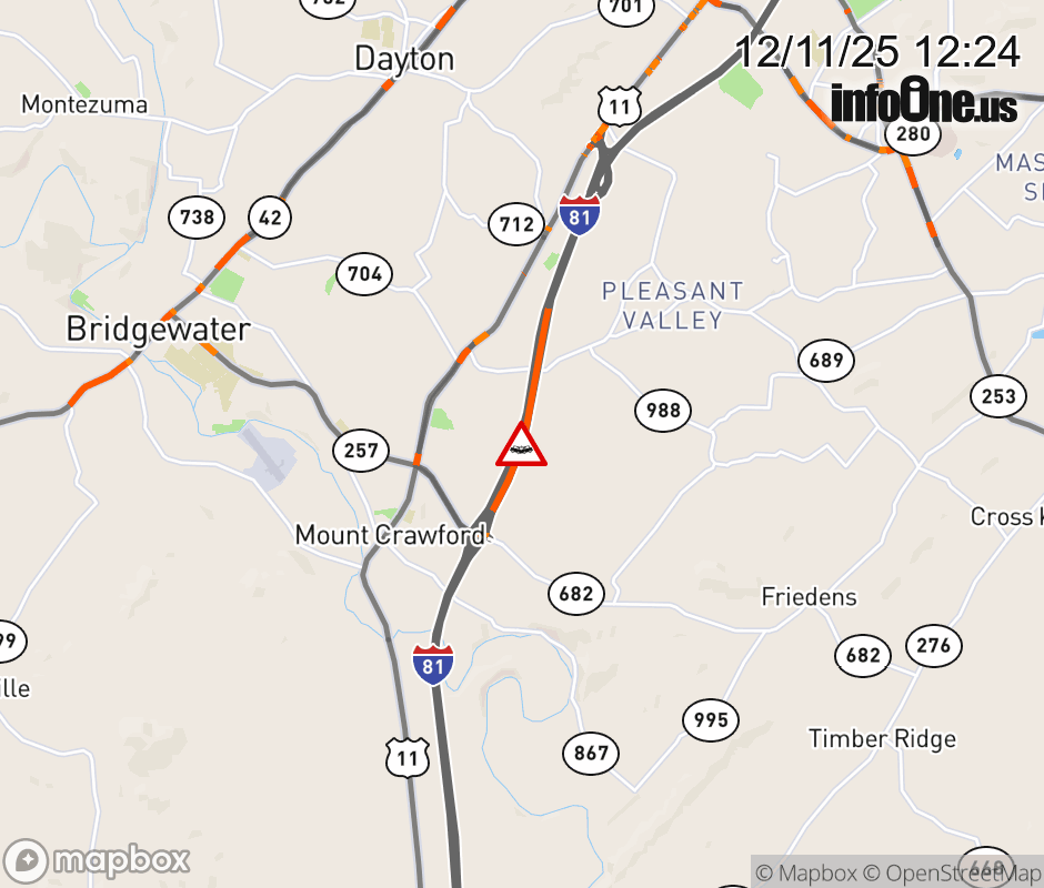 On I-81 North at mile marker 240.9 in the County of Rockingham, motorists can expect delays due to a vehicle crash. Updated: Thu 12/11/25 12:24 PM EST ![]() Updated: Thu 12/11/25 12:24 PM EST |